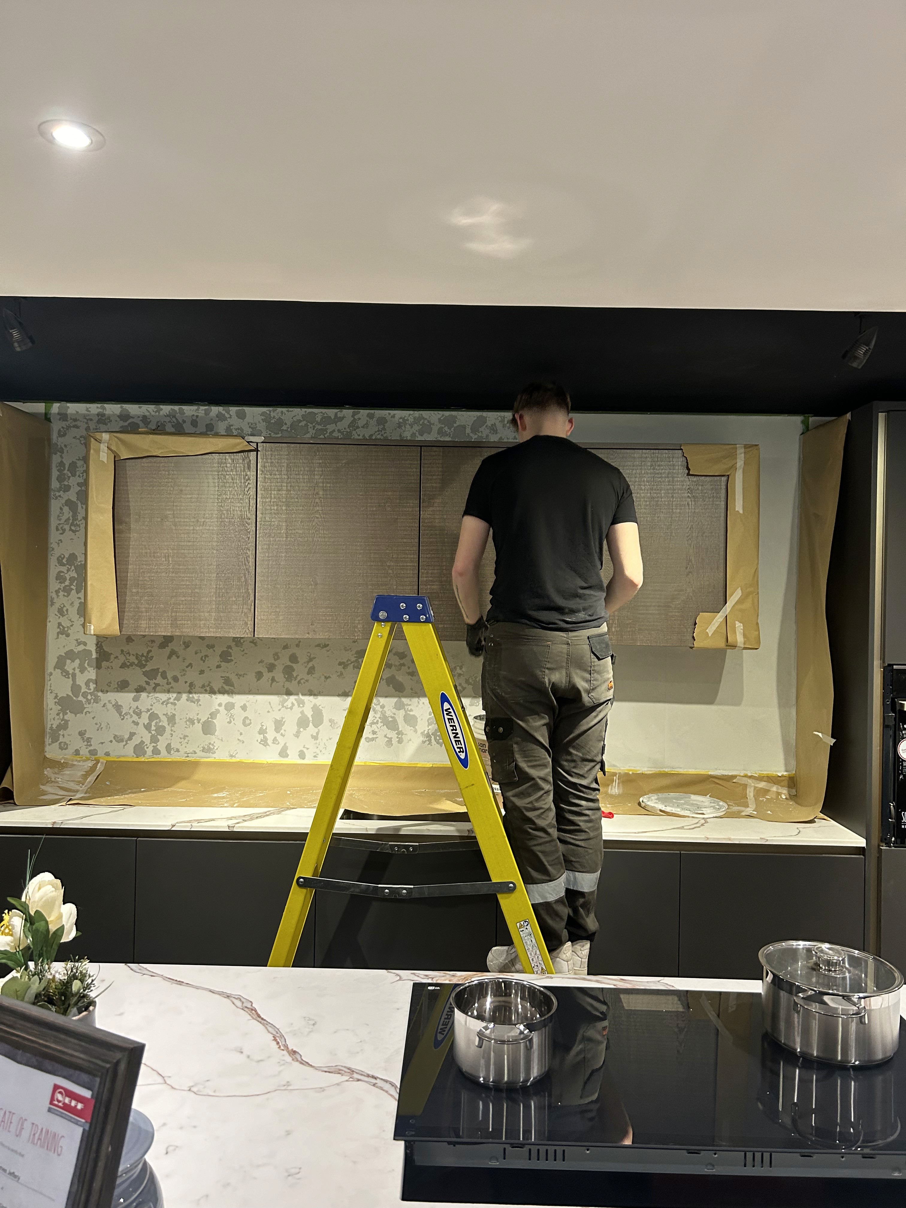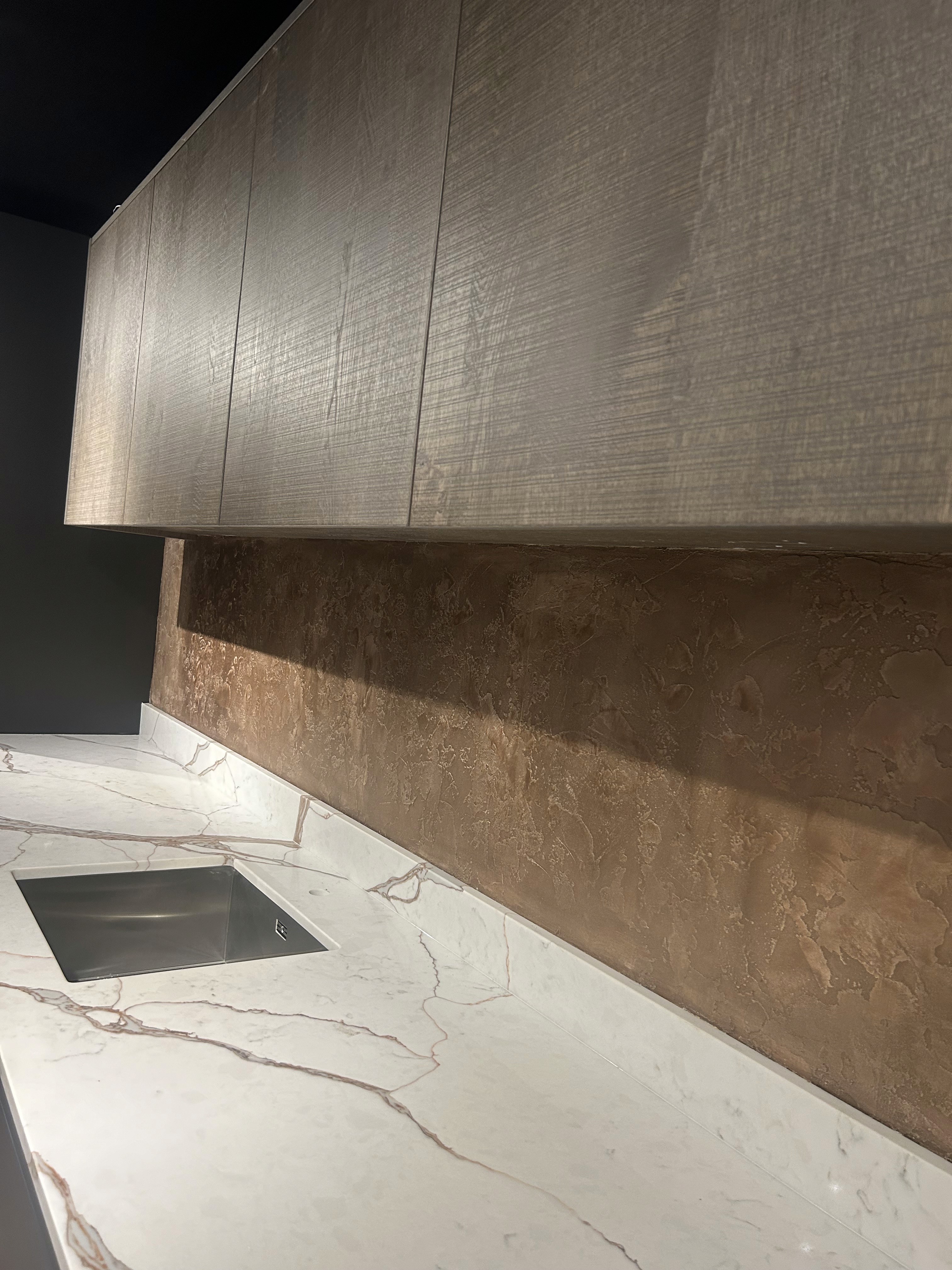 This is a great project we completed inside of a kitchen showroom for a company in Kent. The focus was to enhance their showroom wall and cloakroom with decorative finish in a bronze pearl. This worked nicely with the beautiful marble counters and contemporary units.
