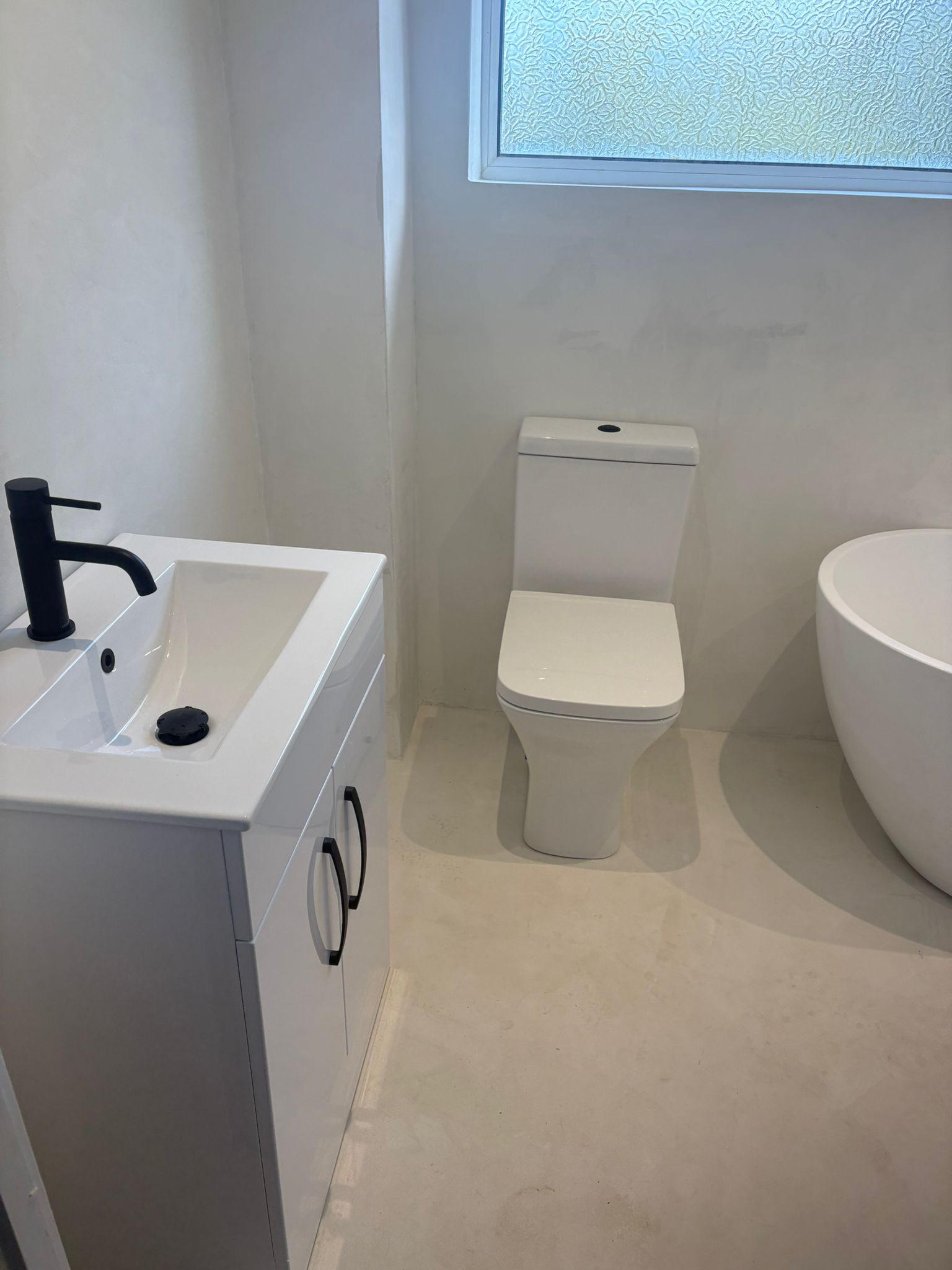 This sleek and modern bathroom transformation was completed in just one week, featuring a seamless microcement finish throughout. The smooth, continuous surface offers a clean, contemporary aesthetic that’s both waterproof and durable — perfect for wet areas like this combined bath and shower space.